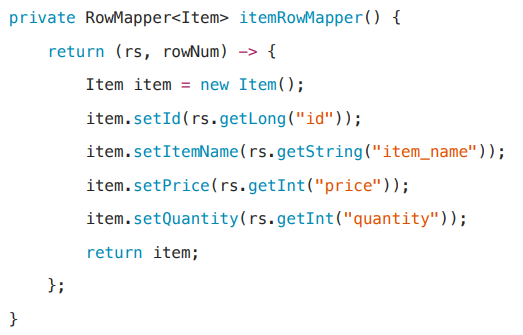 RowMapper<Item> itemRowMapper()처럼 직접 만드는 예시도 들겠습니다.