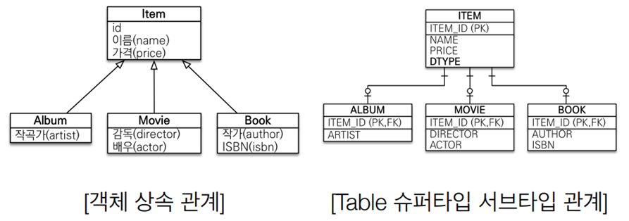 그리고 결과를 받을때는 RDB의 슈퍼타입, 서브타입 각각에 대응하는 객체를 만들어서 대응해줘야 합니다.